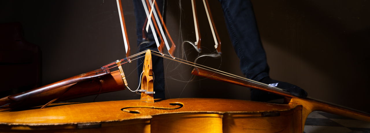 An old broken bow in Baldwin’s family home plotted the path of AUTONOMIA I: Body Without Organs, inspiring new explorations of expanded textural possibilities on his contrabass, using the malfunctioning bow to prepare the instrument in new and novel ways. The bow’s primary defect—the metal heel had detached from the frog’s ebony handle—became the foundation for new sonic exploration. By propping the bow through strings and fingerboard, or balancing between strings and bridge, timbral vibrations intensify when activated by an additional bow. Tracks “scorch atlas” and “hackers” are the only cuts on the album that do not feature two bows, instead using the prepared bow exclusively in the right hand to produce harsh scraping effects or inject visceral punctuations of rhythmic intensity.