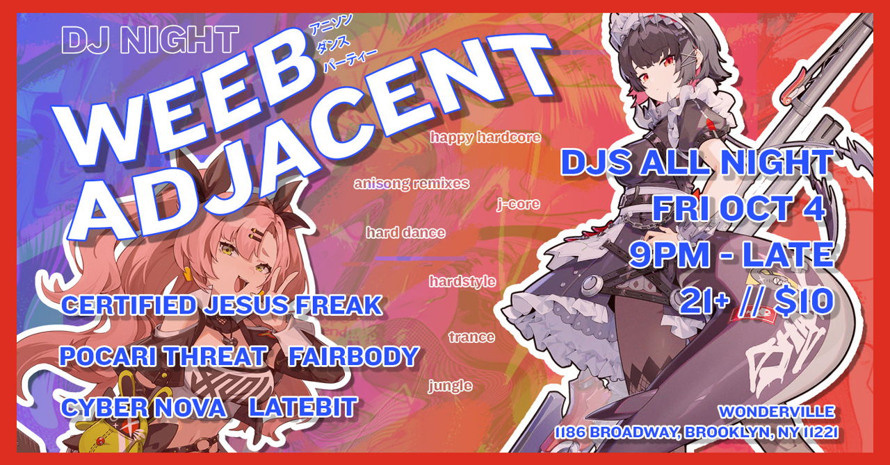 WEEB-ADJACENT is your monthly series of anime con afterhour jams by the best chronically online DJs the algorithm has to offer. Come thru for anime songs, speedcore, hard dance, techno, gabber, jungle, hyperpop, and more!!