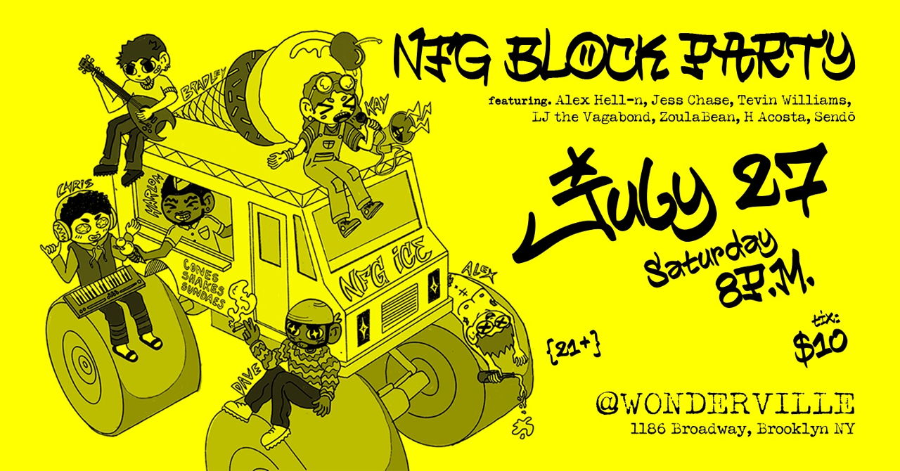 Come join N.F.G. and friends for a musical summer block party you will never forget! N.F.G. @nfgxcollective is a musical collective comprised of Bradley CD @bcd_rom, Dave Langston @davelangstonnfg, Kaylee AM @ohhklee, and Say June @osayjune, but the block doesn’t stop there as we got Alex Hell-n @alexhelln opening up the night, Jess Chase @omgokfine rockin out, Tevin Williams @twmusic, LJ the Vagabond @elijayteevee, Zoulabean @zoulabean all spitting, H Acosta @m.arcos.h with a sweet jazzy jam and Sendō @sendo.music closing out the night. We also got Rob Ruth @robruthco doing visuals, Alex Vrahas @swetshop.tv hosting, and Kristen Victorias @kristenvictorias making an appearance as well! Pull through and cool off!