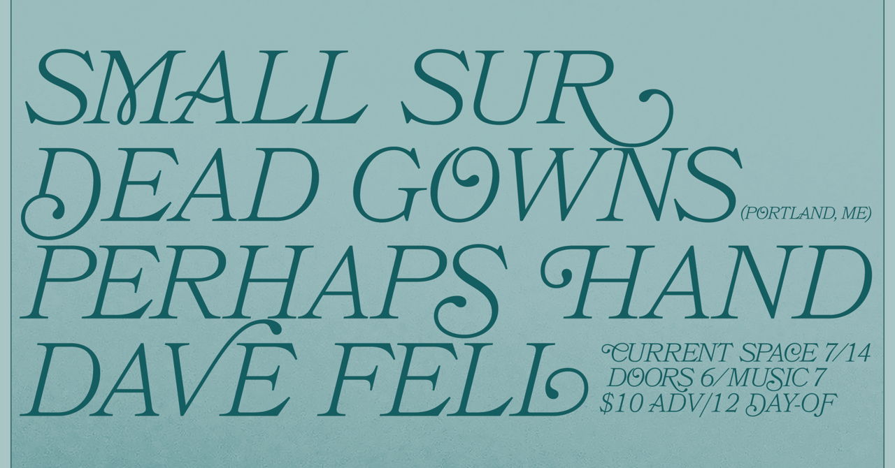 Small Sur, Dead Gowns, Perhaps Hand, Dave Fell outdoors at Current Space on Friday, July 14th at 6:00pm!