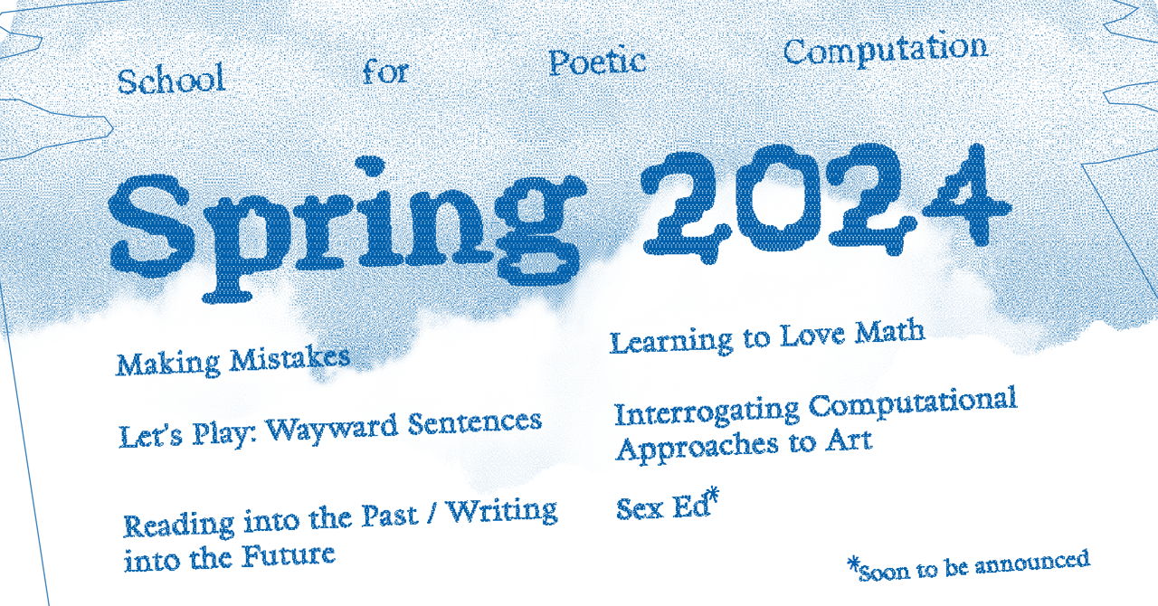 The School for Poetic Computation would like to welcome the participants of the current season in our Orientation. Learn about the history of SFPC, our Community Agreements, and meet your fellow classmates alongside peers outside of your class. All new and returning participants are invited to join. Orientation is mandatory, one-day only, and takes place in-person and online. Light refreshments will be provided for those joining in-person; bring your own snacks and beverages if logging in online.