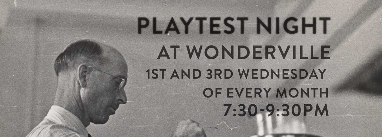 Playtest night at Wonderville is a chance to help make the games of tomorrow by playing works-in-progress and providing feedback to developers. $5 donation encouraged.