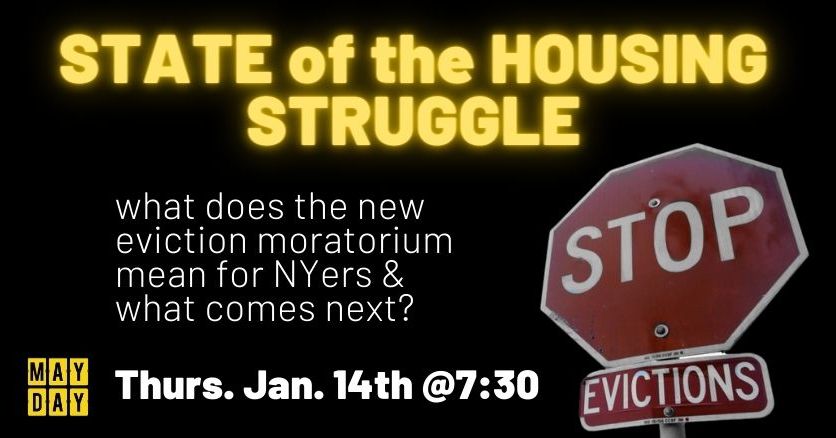 On Dec. 28th, Gov. Cuomo signed into law a bill pushed by the tenant movement to stop evictions in NY until at least May 1st. This was a huge win but the fight is not over. Come hear from organizers and housing lawyers about what these changes mean for you and your neighbors.