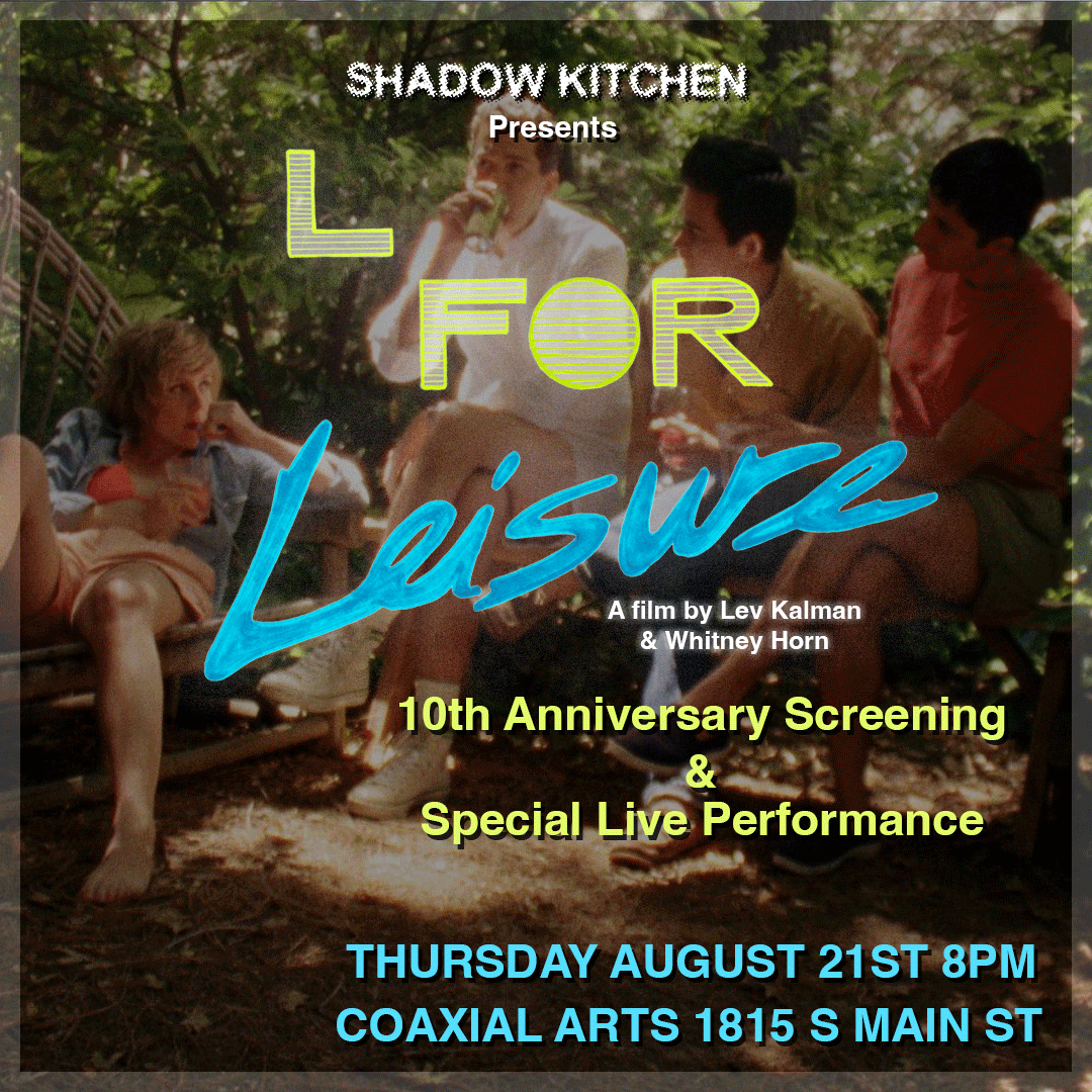 For August, Shadow Kitchen presents a special 10th anniversary screening of L FOR LEISURE (2015), the cult 16mm comedy by Lev Kalman and Whitney Horn.