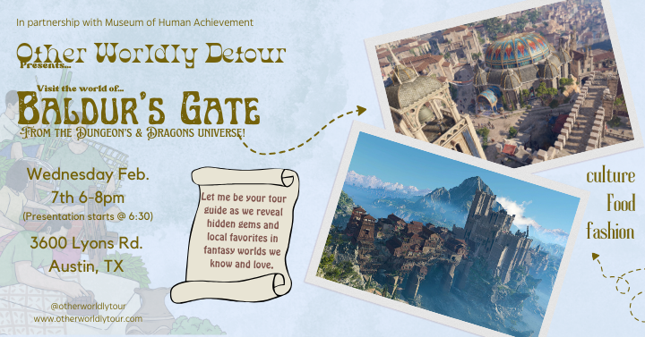 Our first expedition takes us to the mythical city of Baldur's Gate, from the epic Dungeons & Dragons saga. More than just a backdrop for adventures, Baldur's Gate teems with unique customs, cuisine, and characters – each with stories waiting to be told. We're bringing this vibrant city to life, offering you a chance to taste its delicacies, dress in its styles, and even learn a bit of its lore.