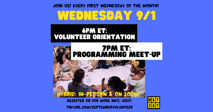 If you're a new volunteer, or want a refresher, join us at 6:00 pm ET *VIRTUALLY* for an orientation led by our Co-Director, Ingrid! Learn about Mayday and say hi to our new staff!