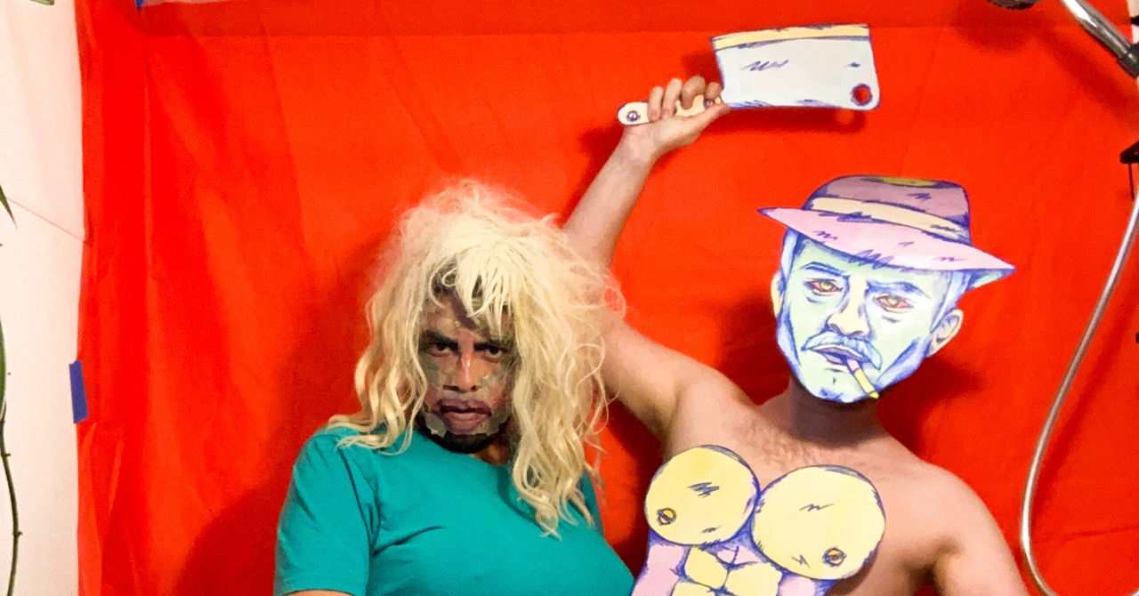 Giallo cinema burst through the 1960s and '70s with color, mystery, and kills. For "A Top in a Bottom's Skin," Dakota Noot and Christopher Anthony Velasco resurrect and queer the giallo, using a pre-recorded video on livestream. Velasco's drag brings agency to women in the giallo genre, not waiting for characters like inept detectives, bartenders, and go-go boys to save her. Noot's paper props and masks bring a comic, cartoonish quality to an already convoluted script and genre. Queerness was rare in Italian giallo: confined to minor characters or homoerotic titilation. Instead, Noot and Velasco get messy and deadly in their own narrative.