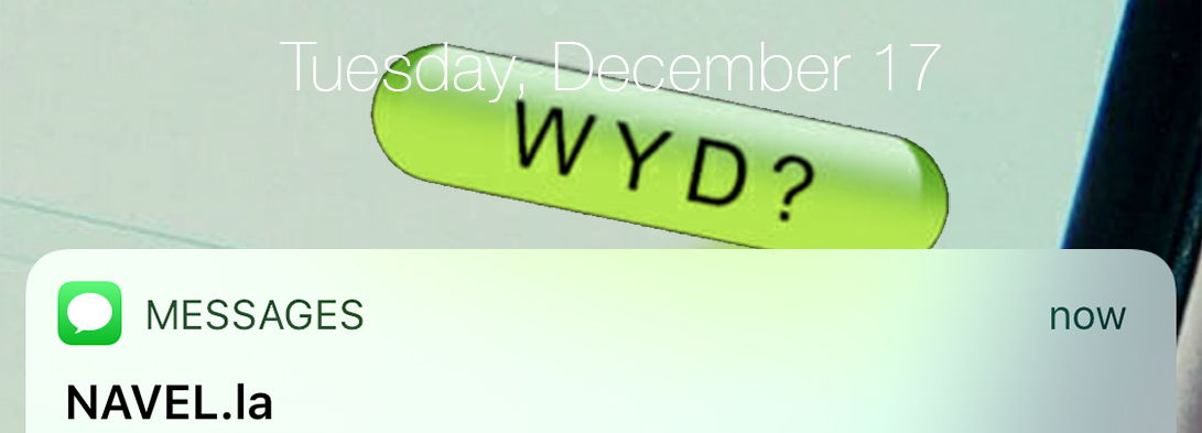 This Tuesday, December 17, join us for WYD?, an intimate and informal monthly gathering where members of the NAVEL community come together to present, test, perform, share, screen and talk about their work, thoughts and current research topics.