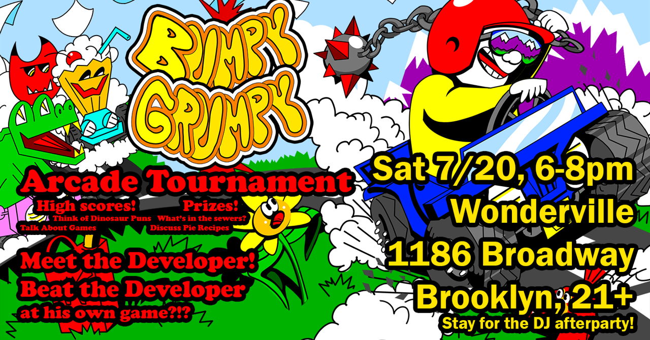It's a high score tournament for everyone's favorite lost 80s arcade game: Bumpy Grumpy! Play for the high score, meet new friends, and trade tips on driving like a maniac. Nathan Fouts, developer of Bumpy Grumpy, will be there as well! Tell him to his face how tough the game is, or give him a high-five because the game is fun to play. It's the first, official high score tournament for Bumpy Grumpy in the known galaxy. Everyone gets to practice some first, then sign up to get into a score bracket, and then drive like crazy to get the high score!