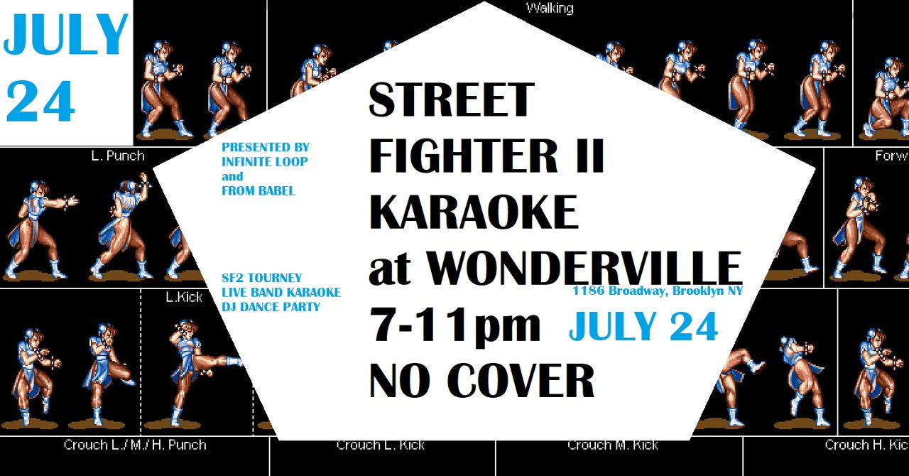 Event starts at 7pm on July 24, SF II tourney at 8pm and live band karaoke at 9pm, followed by a presentation from FROM BABEL and finishing with a DJ dance party. No cover!