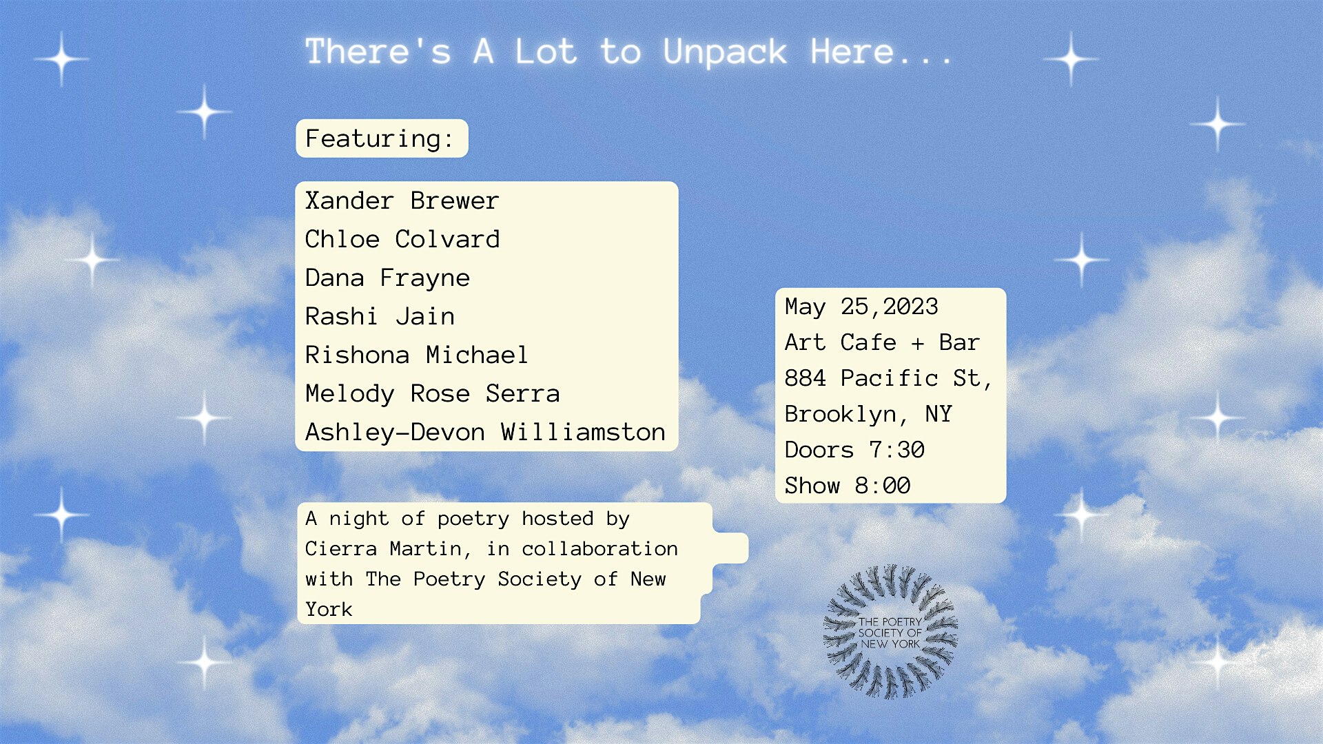 Hosted by Cierra Martin and co-produced with The Poetry Society of New York. Donations are encouraged but not required. For more information, visit @taltuhpoetry on Instagram!