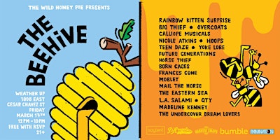 It's almost time for Austin's favorite music marathon which means our annual unofficial party, The Beehive, is coming up fast! We're buzzing to announce a full day and night of music at Weather Up in downtown Austin featuring performances by our favorite bands playing the festival as well as lots of goodies from our friends at Harvest Snaps, Bumble, D'Angelico Guitars, Soylent and Pamnation.