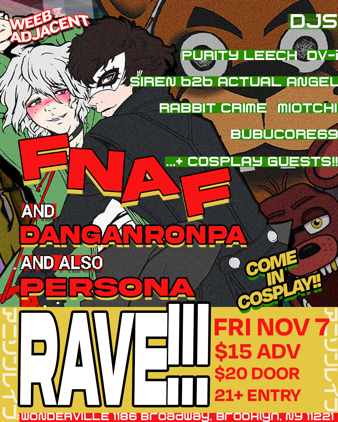 Come party like it's '87 with your friends Chika the Kitchen, Bonnie the Bon Bon, Foxy the Foxy Pirate (GRRRR) and Yellow Freddy Fivebear (who is yellow and weird) BUT ALSO Nagito Femboy fans, that weird talking cat from Persona 5, Shin Megami Tensei completionists, and so much more! There will be NO animatronics at the show but feel free to put your friends in a fursuit!!!