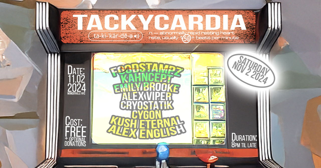 Tackycardia returns to Wonderville for our 17th event with yet another star studded 150+ bpm lineup. This go around we’ll be featuring local DNB artists Kahncept, Foodstampz and Cygon as well as longtime NYC contributor Alex English (formerly of Girls & Boys). We’ll also have the return of Emily Brooke for another live performance as well as the debut set of Kush Eternal. Rounding off the card are your usual residents Cryostatik and Alex Viper. We’ll have an extra hour due to DST so while the sun may go down early the show will be going late :)