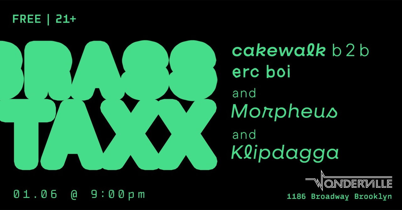 Brass Taxx. A night of DJing with Cakewalk b2b erc boi and Morpheus with Emily Ball. Enjoy games and tunes starting at 9pm. erc boiCakewalkMorpheusKlipdagga