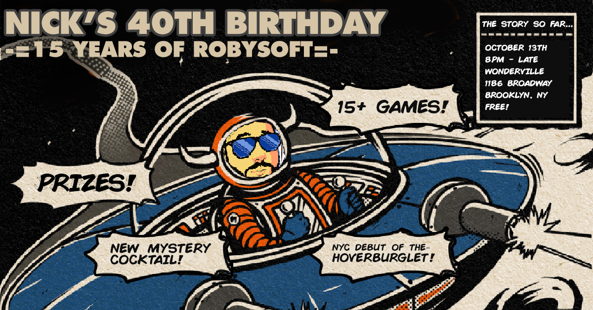 Come celebrate 40 years of Nick as he celebrates 15 years of game development as ROBYSOFT -- a myriad of games and other projects from over the years (including one written by an 11-year old in 1993) will be running alongside the rest of the Wonderville collection including the mysterious HOVERBURGLET; a mini-sized arcade cab with a brand new game, rotary control, and three displays. Earn the top score by night's end and walk away with a very savory prize!