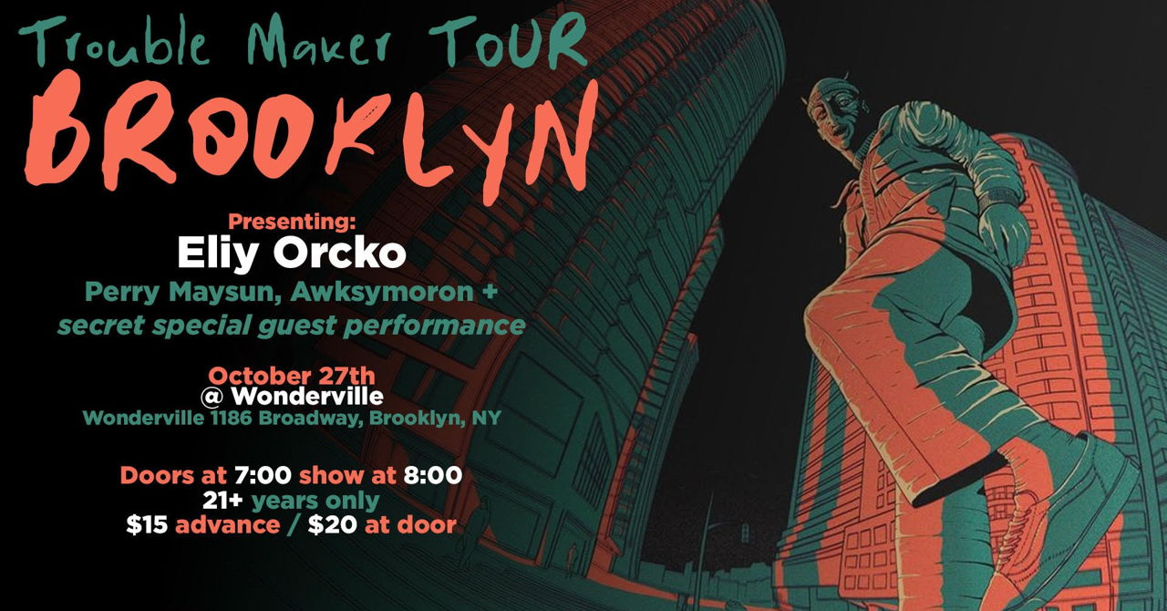 Come join the Jazz Ghoul @Eliyorcko on the last leg of their "Trouble Maker" tour in Brooklyn as they make their way back from Europe connecting with @awksymoron and @perrymaysun for local support! Also a secret guest performer! this mix genre bill will be filled with rock, hiphop, and jazz $15 Doors at 7!