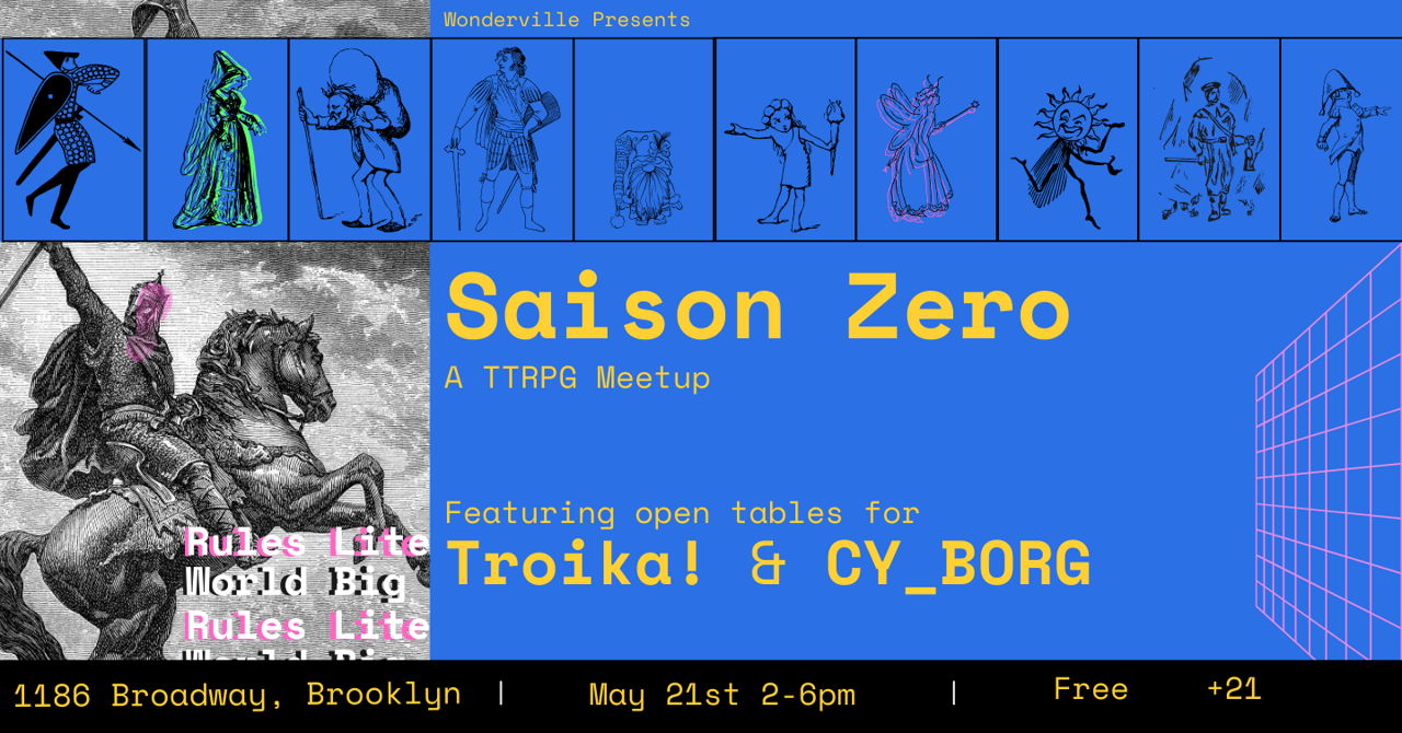Hello! Lovely people, looking to jump into the wide world of TTRPGs like D&D, but don't want to all day learning the rules? Looking to meet fellow nerds who are into roleplay (of the tabletop variety)? Come on down to Saison Zero! Here we're light on rules, but rich in flavor! This month we're having tables for Troika! and CY_BORG