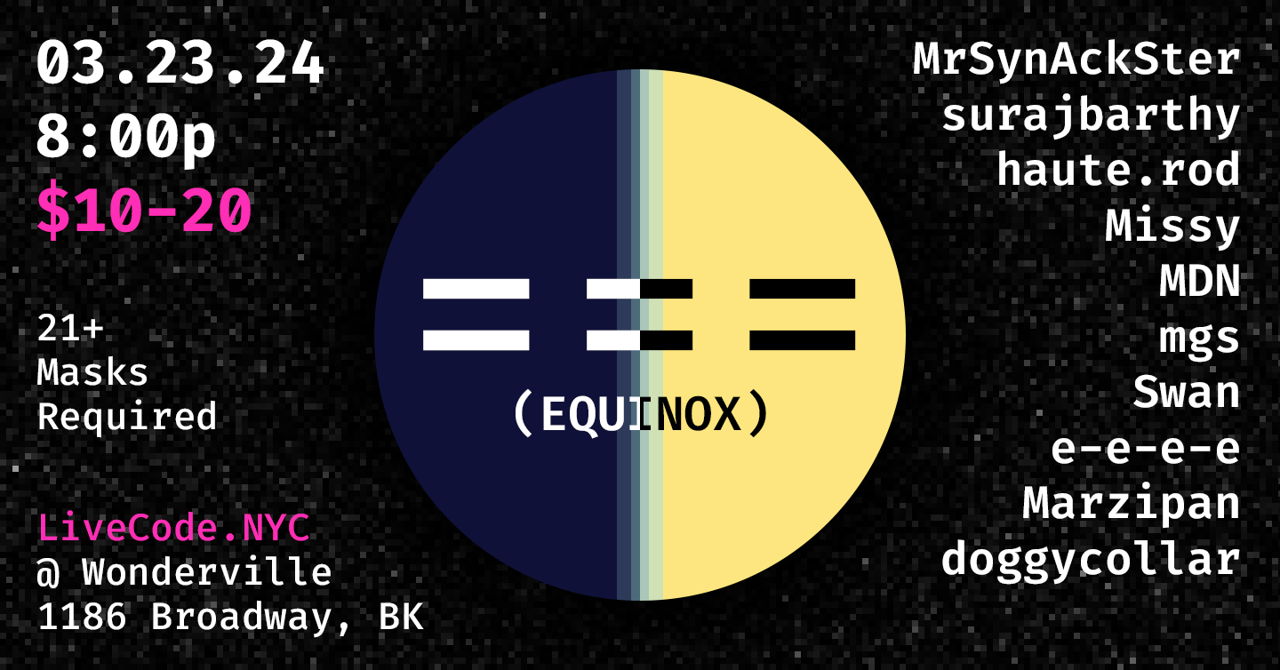 Join us for a celebration of the Spring Equinox with LiveCode.NYC on March 23rd starting at 8pm! The Algorave will feature audio visual performances by local and guest artists. Bunny hop over to welcome the sun!