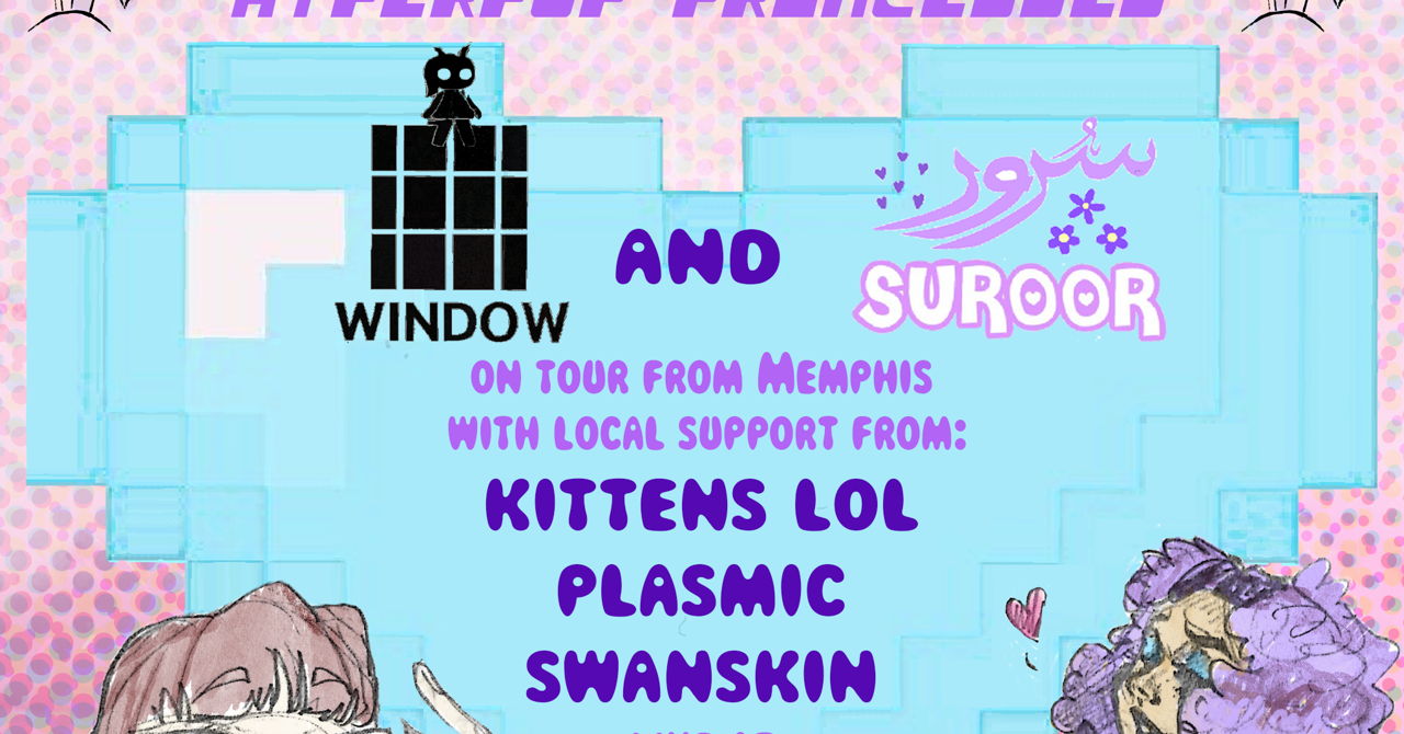 This music event showcases Memphis and LA's finest: two touring acts from Memphis (suroor and W1ND0W) join three LA locals (Plasmic, Swanskin, and kittens lol) for a night of musical exploration through various interpretations of hyperpop music. For listeners that strive to stay in touch with the latest innovations in the contemporary music scene, this event is not to be missed.