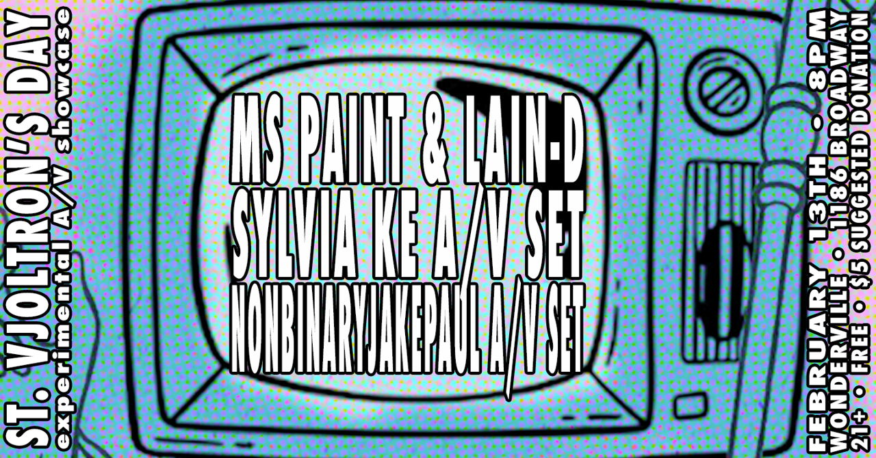 Come celebrate your love for Experimental A/V Performances with the first annual St. Vjoltron's Day Dance! Shake your butts while watching Real-time Audiovisual performances from NonbinaryJakePaul, Sylvia Ke, and MS PAINT w/ LAIN-D !!!