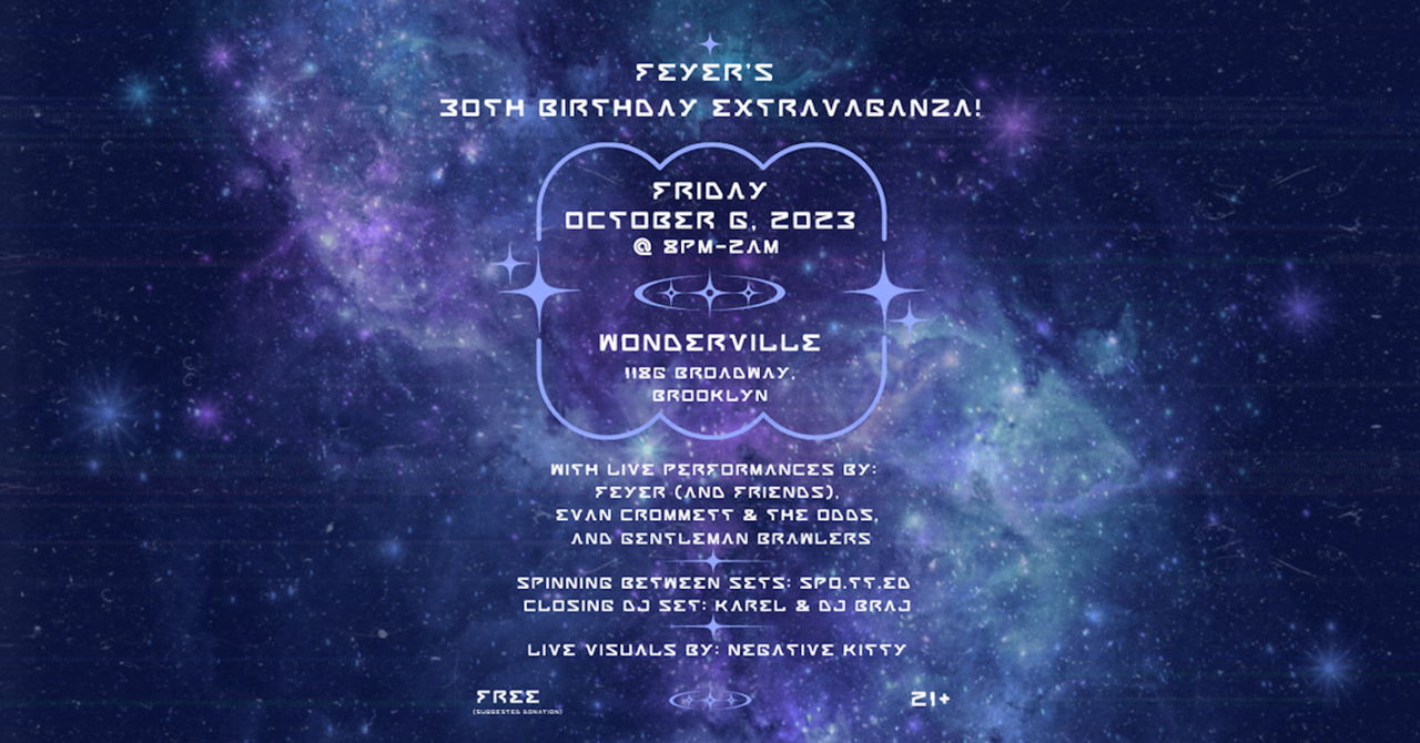 Live at Wonderville! Come join Feyer as he and his friends ring in his big 3-0 with live music performances, DJs, dancing, drinks, and existential dread.