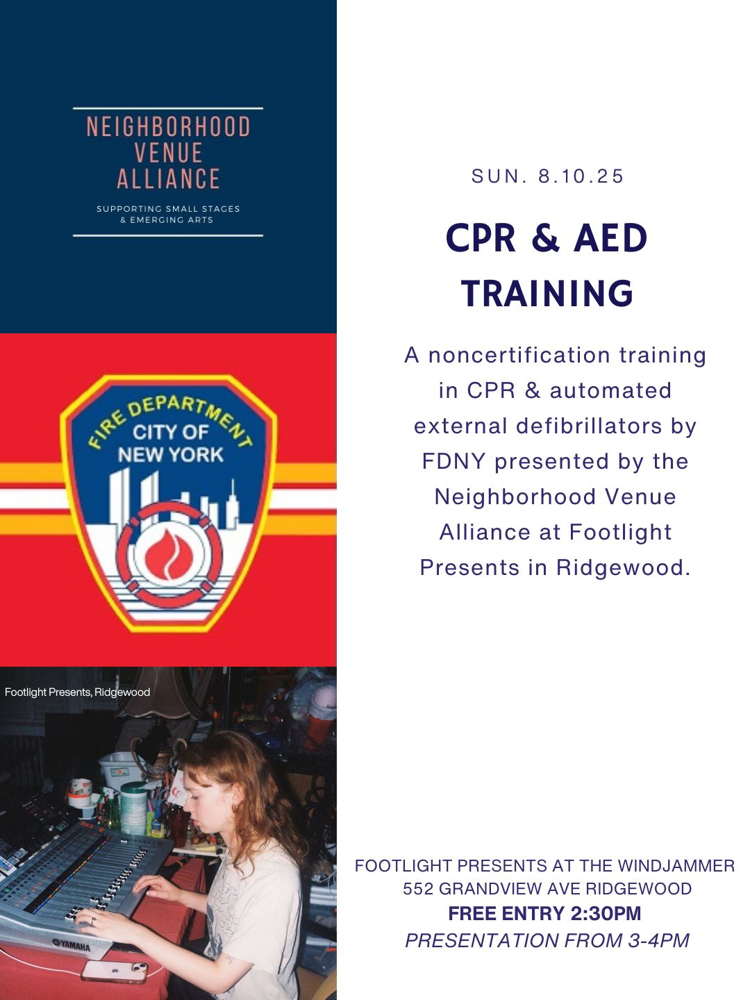 The Neighborhood Venue Alliance is hosting a non certification CPR/AED training session with FDNY on Sunday.