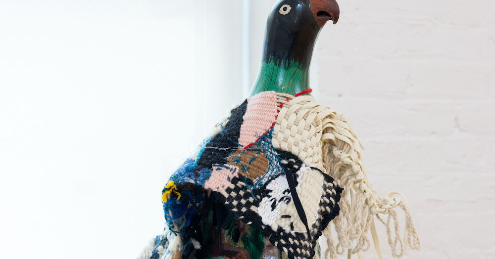 Candace Hill-Montgomery (b. 1945) is a Queens-born artist now based in Bridgehampton, Long Island, whose decades-long career has spanned a wide array of media and approach: painting, photography, installation art, public interventions, video, poetry, performance, and fugitive combinations thereof. Over the last ten years, Hill-Montgomery has largely worked with weavings made on homemade looms, cunningly fusing an assemblage of techniques and materials including sheep’s wool, mohair, linen, paper yarn, and other fabrics, often augmented by found objects. The pieces are typically exquisitely layered in both composition and subject matter, bursting at the seams with color and movement, mirroring her iterative and free-associative poetry practice and variously drawing from pop-cultural and religious iconography, vernacular textile craft, art-historical and literary references, and delirious, free-wheeling wordplay.