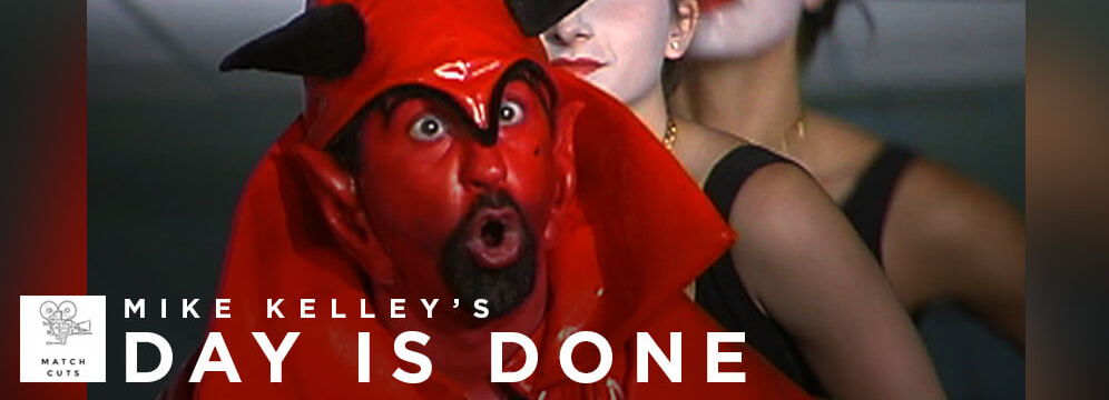 In DAY IS DONE, these restagings take the form of “folk entertainments” that Kelley memorably subverts. Featuring characters such as Motivational Vampire, Morose Ghoul and Devil/Barber, much of the action—antic song-and-dance numbers and dramatic scenes, with Satan as emcee—takes place in a generic school gymnasium and a wooded landscape.