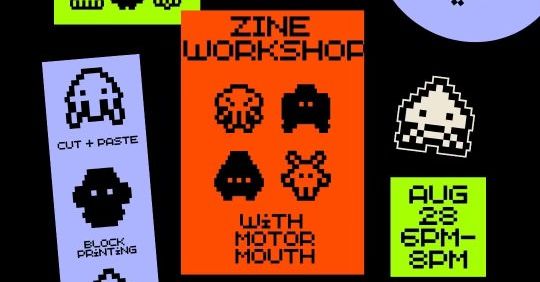 MotorMouth is hosting a zine workshop August 28th from 6-8 PM, showcasing different templates and techniques such as block printing and collaging. Come cowork and share space with other zinemakers! A variety of materials will be provided. Tickets are sliding scale $10-$30.