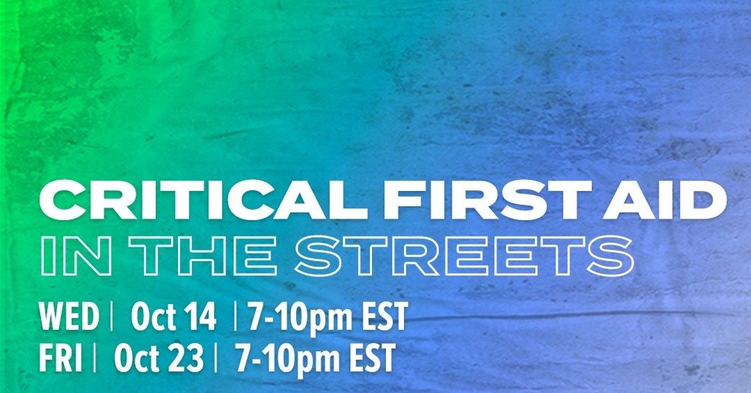 Join NYC Action Medical and Mayday Space for two free online bridge trainings about providing life-saving interventions in protest situations. We will be offering live captioning, and participants will receive a follow-up email with resources. The two dates for the Critical First Aid Streets training on this page are on Oct 14th and Oct 23rd 7-10pm. You only need to attend one. This training does not require any previous medical knowledge. (Note: If you are a medical professional, consider attending NYCAM’s online bridge training to learn how to run as a street medic on Tuesday, October 13 or Sunday, October 25: https://tinyurl.com/bridgeaid)