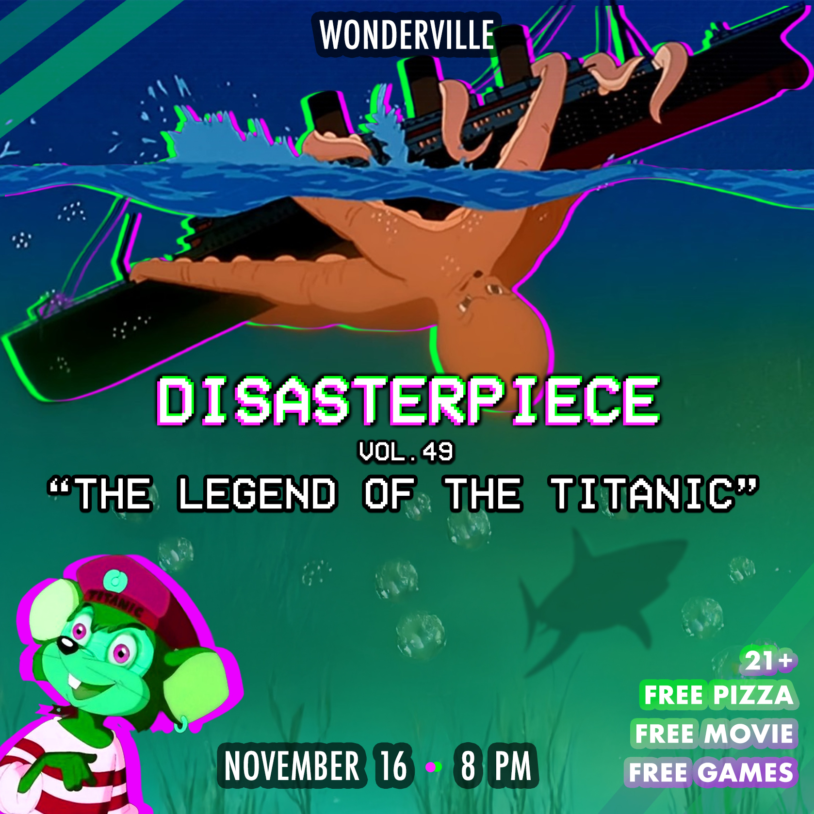 Disasterpiece, Brooklyn's favorite BAD movie night, is back with a Titanic-sized disaster of a film, THE LEGEND OF THE TITANIC. This dumpster fire is an animated retelling of the tragedy of the Titanic, but with talking animals and an adorable giant octopus. It's so cute you might almost forget how offensive it all is. Join us for free pizza, giveaways, and all of the Titanic trivia you can handle.
