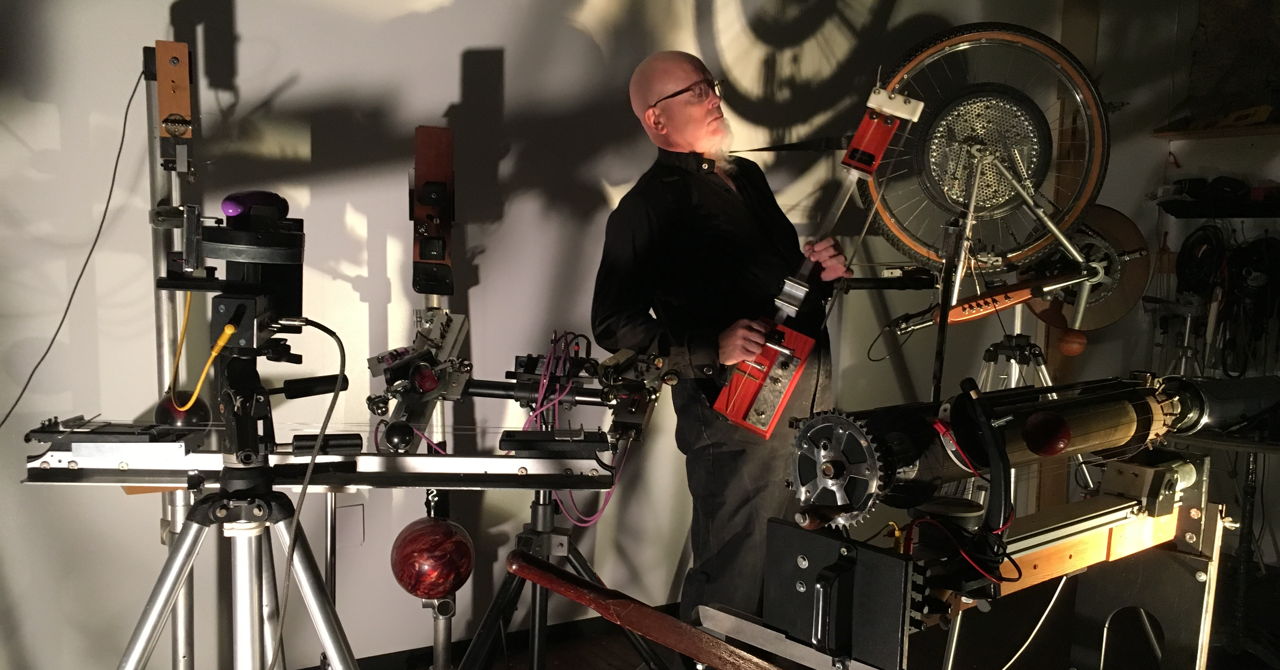 Sound Mechanic Neil Feather has been creating radical and unusual musical instruments since 1970 and is increasingly known outside of Baltimore as one of the most original musical thinkers of his day. His instruments each embody uniquely clever acoustic and engineering principles, and are visually arresting. The music he plays on the instruments is equally original, embodying new principles and resulting in a nearly alien idiom of music.