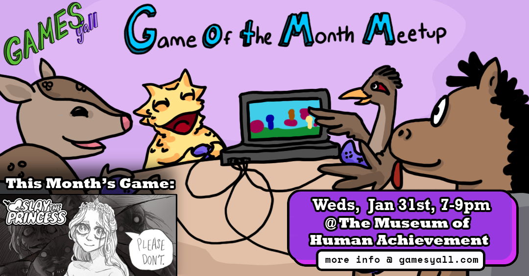 Games Y’all is a monthly meetup presented by the Museum of Human Achievement for indie devs, digital artists, and games fans.