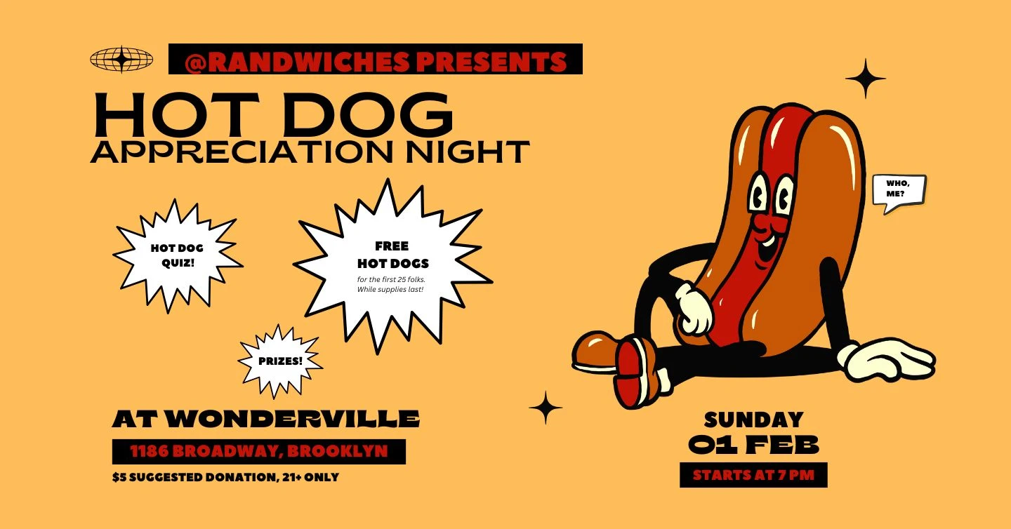 Come one! Come all to the 4th annual Hot Dog Appreciation Night hosted by Jenn de la Vega of Randwiches. Let's celebrate the best Wonderville hot dogs of 2025. The winning hot dog will be served at the bar and a special trophy will be awarded to the best name. Everyone who helped name a hot dog will receive a certificate on the stage (or it will be mailed to you). Join in on the big hot dog quiz and win a prize basket! Free plain hot dogs for the first 25 guests in the arcade (the hot dog specials will be for sale at the bar while supplies last).