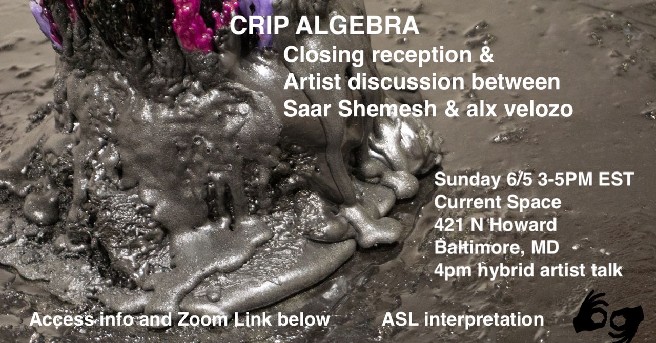 \[Image Description: White text is overlaid on a wet black puddle of resin. Black foam flows down from a cluster of inverted black, lavender, and magenta wax drips. The text reads: “CRIP ALGEBRA, closing reception & Artist discussion between Saar Shemesh & Alex velozo. Sunday 6/5 3-5pm EST Current space 421 N Howard Baltimore, MD. 4PM hybrid artist talk. Access info and Zoom Link below. ASL interpretation.”\]