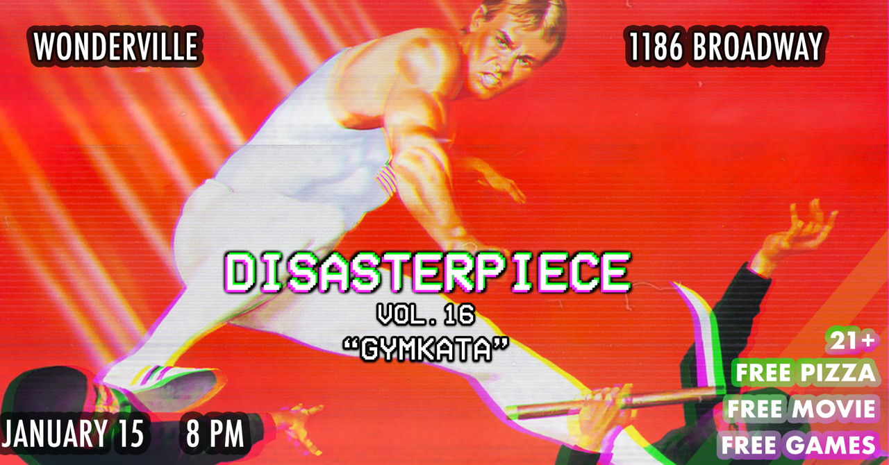 Disasterpiece is a movie night all about unearthing weird, forgotten VHS gems. This month it’s ‘Gymkata’, an explosive martial arts film starring an Olympic gymnast. "The skill of gymnastics, the kill of karate." Themed drinking rules, trivia, and mediocre pizza provided.
