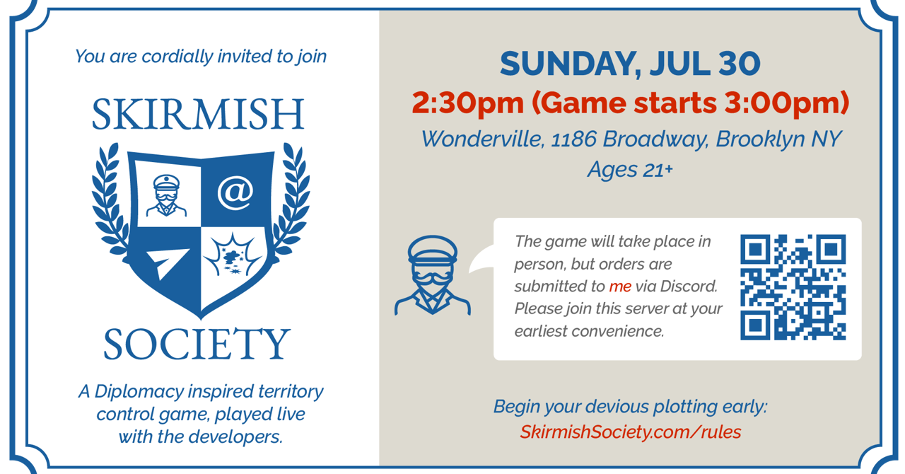 Join us for a live round of Skirmish Society, the Discord embedded war-game! This will be a fast-paced, IRL version of the game, hosted by the devs.