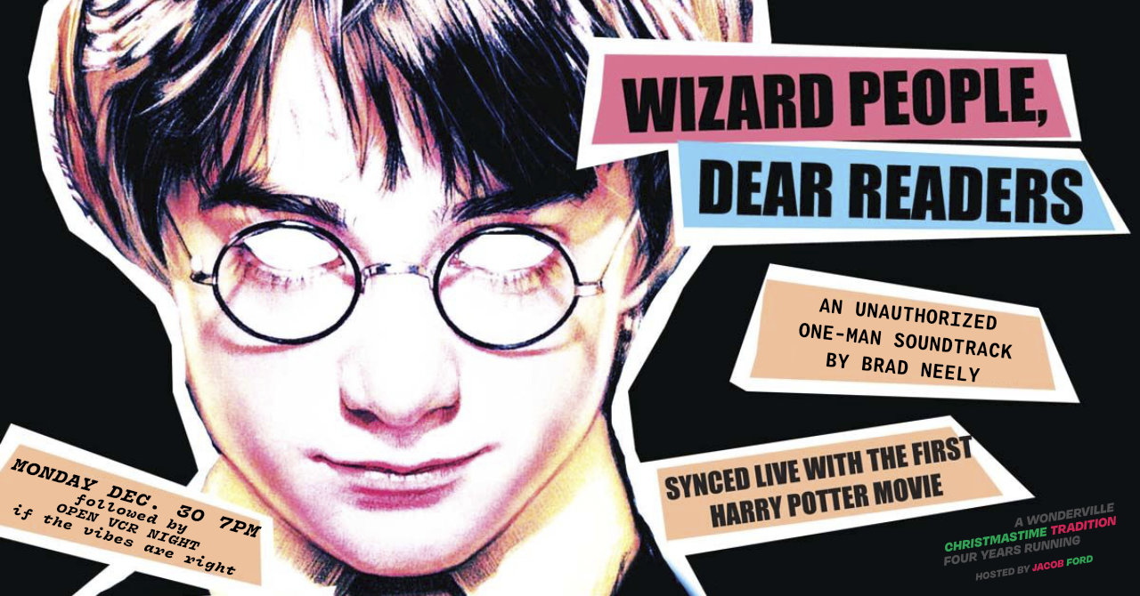 So, for the fourth year running, it's Brooklyn's favorite illegal art holiday tradition: Jacob Ford's annual screening of Wizard People, Dear Reader: an unauthorized soundtrack to the entire first Harry Potter movie, voiced entirely by Brad Neely.