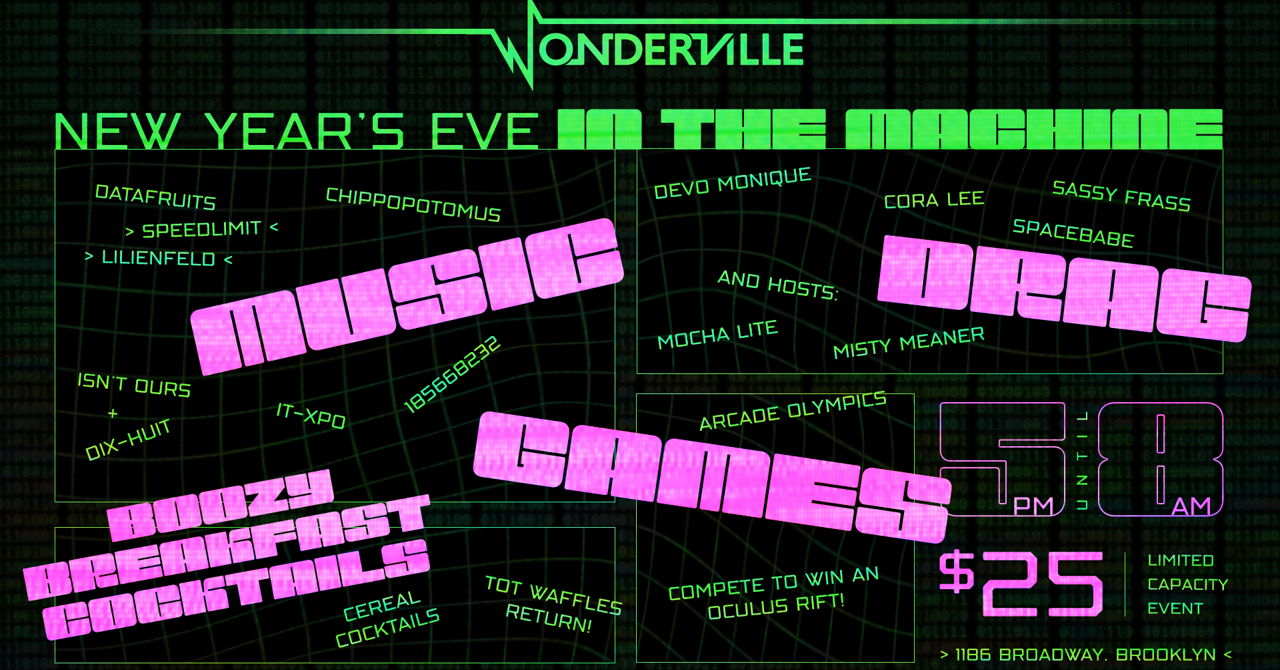 Join us for New Year’s Eve at Wonderville! We got a permit to stay open until 8am and we’ve got 12 hours of music, games, and surprises to help you party through the night!