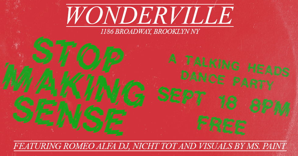 A Talking Heads dance party! We'll be screening Stop Making Sense two times, once to open and once to close. Big suits optional but highly encouraged. We'll have two DJ sets (featuring visuals from ms. paint) in-between: