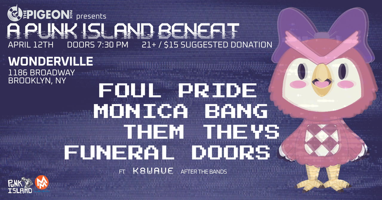 The Pigeon Pack is a DIY music collective in NY and we're excited to announce our first benefit show of the year to raise funds for the 16th year of Punk Island, NY's longest running DIY punk music fest! We're proud to announce that we'll be taking over Wonderville again to host our show featuring: Monica Bang, Funeral Doors, Foul Pride, Them Theys, and a DJ set by K8wave