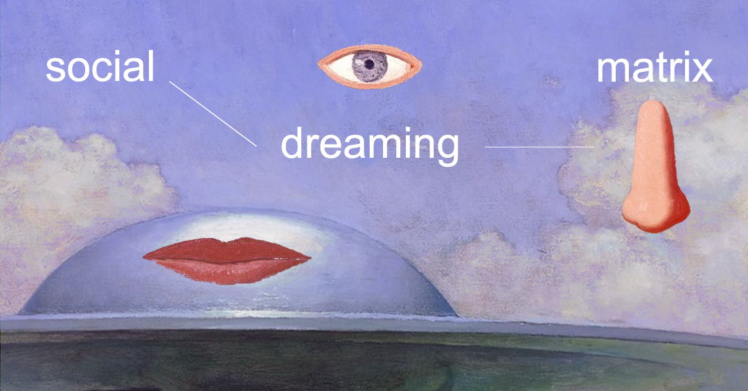 This practice opens a space for participants to safely share night dreams, sensory free association, and connected dreams emerging from what we share. Here, we offer our dreams as shared images for a collective reverie, available to associative transformation and re-telling by the group. Those who don't remember night dreams (or don't wish to share one yet) are still fully able to engage in Social Dreaming through the dreams offered by others.