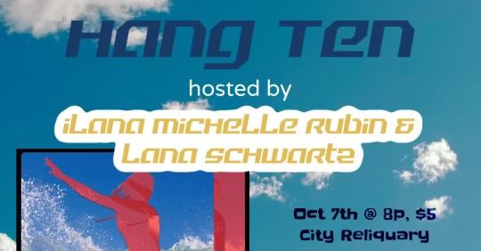 Hang Ten, hosted by Lana Schwartz (The New Yorker, The Hairpin) & Ilana Michelle Rubin (Reductress, MTV) is a chance for audiences to soak up some good vibes while comedians share some of their tried (and not-so-tried) material. We'll laugh, take it easy, and of course, hang ten. Featuring Savannah Desormeaux (New York Comedy Festival, American Horror Story), Zubi Ahmed (Kutti Gang, South Asian Film Festival), Tim Platt (Comedy Central, Story Pirates), Maya Deshmukh (Azn Pop, The Other Two), and Alison Leiby (The Marvelous Mrs. Maisel, The President Show).