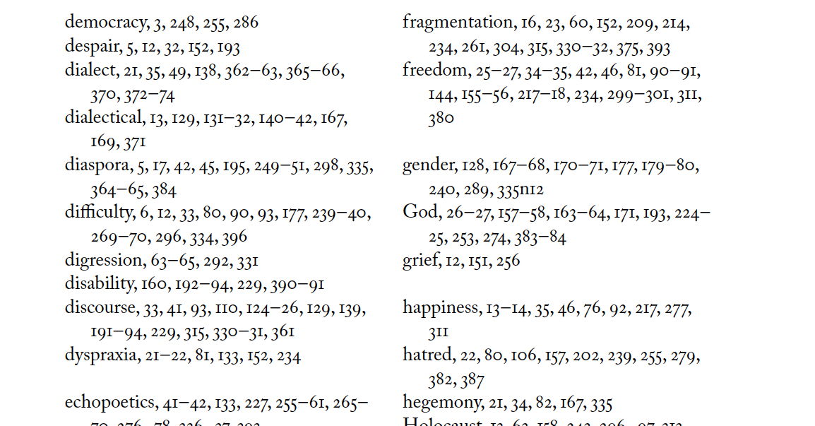 It includes not just poetry but essays on aesthetics and literary studies, interviews with other poets, autobiographical sketches, and more. It's a dialogic novel, a very long poem, and a grand opera all wrapped into one.