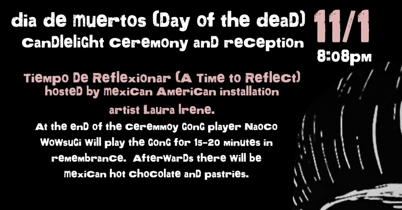 An altar will be constructed and on view from Nov 1-3 in which the public can bring a photo or object of their loved ones to place on altar during this time. The public is invited to join us for this safe, thoughtful and communal experience. This night of remembrance and community is meant to create a much-needed space as we continue to process our continued loss especially for the people of Palestine as a genocide is taking place before our eyes, the loss of human lives every day is erasing lifelines of entire families and has been for the past 75 years. The altar will be dedicated to Palestine and for everyone who has lost a loved one in their life. You do not have to know someone that has passed on to participate, as your presence will be welcome as support. Loss is defined not just as in death, all types of loses need healing. You can speak or not speak; you can bring a photo or a poem whatever you like. At the end of the ceremmoy gong player Naoco will play the gong for 15-20 minutes in remembrance. Afterwards there will be Mexican hot chocolate and pastries.