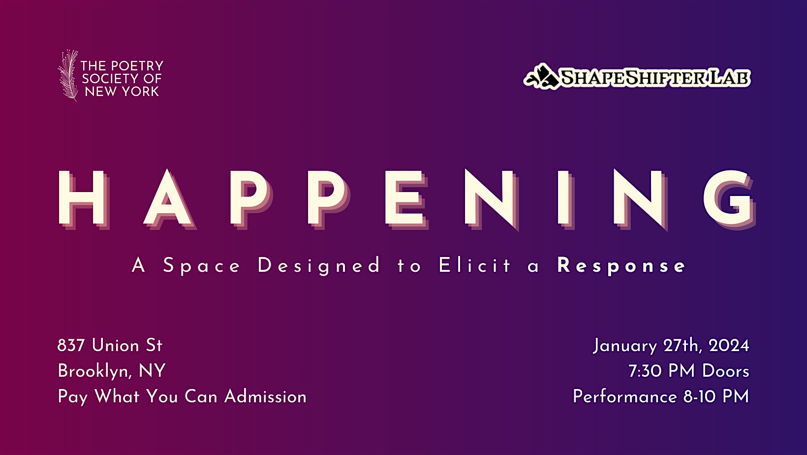 Happenings is an event series designed to generate artistic collaborations. Each event invites creators of all mediums to come and create new work spontaneously and in dialogue with one another—consider this a space to generate new work.