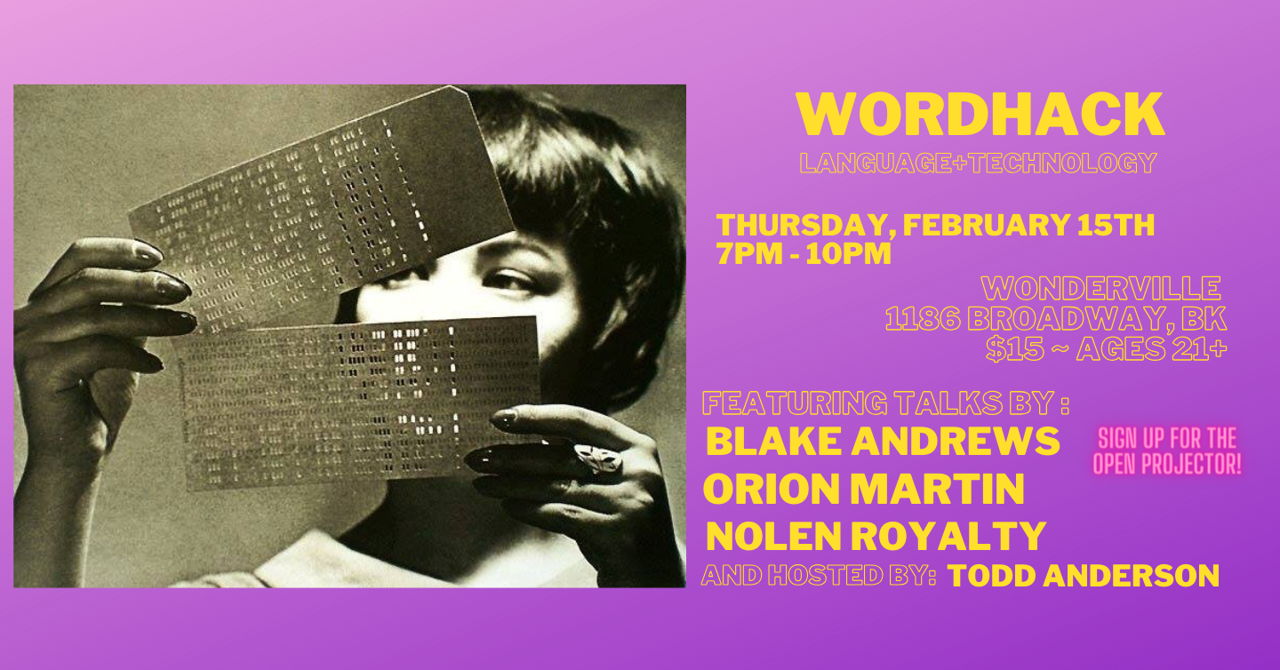 WordHack is a monthly evening of performances and talks exploring the intersection of language and technology. Code poetry, digital literature, e-lit, language games, coders interested in the creative side, writers interested in new forms writing can take, all are welcome here.