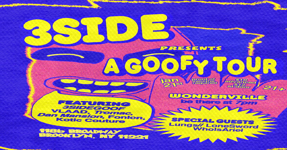 Maryland, Virginia, and New York's best and brightest Hip-Hop artists connect to bring you a night of eclectic, authentic, and exciting lyricism, production, and energy. 3SIDEGOOF is joined by fellow 3SIDE members VLAAD, Tromac, and Fonlon, as well his friends Dan Mansion (who has opened for Meek Mill), Kotic Couture (who has performed at the historic Kennedy Center), Lungs//LoneSword (whose music is currently viral on Twitter), and WhoIsAriel (whose music reels have garned several thousand views). None of these artists sound like one another--or like anyone else for that matter--and that's what will make this an unforgettable night for Hip-Hop music.