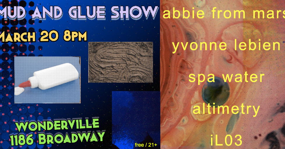 An unreal evening of mind-melting sights and sounds that will honor two of the most crucial substances of the Earth's ecosystem: Mud and Glue. Featuring Abbie From Mars (@abbiefrommars), Yvonne Lebien (@yvonnelebien), Spa Water (@spawatermusic), Altimetry (@altimetry_music), and iL03 (iloe_yeah).